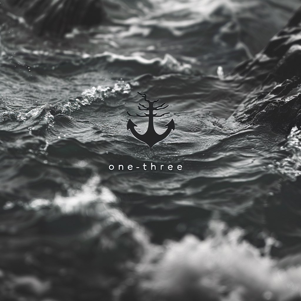 A massive anchor standing defiant against turbulent waters. Monochromatic blue-gray. The raw power of the sea.